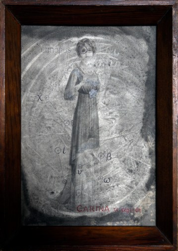 Dénombrer les étoiles : voici un jeu que tout artiste tente un jour, puisque c’est à lui qu’a été donné le pouvoir de bouleverser les codes de l’espace et du temps. C’est en cela que Lilian Euzéby est poète. Ici, l’ensemble est magistral et imposant (3m/haut sur 7m/large), en parvenant à résoudre le défi de donner à rassembler en un regard 88 constellations. L’œil est soudain rendu tout-puissant et s’attarde avec bonheur sur chaque constellation, en allant du général au particulier. Lilian Euzéby devient le petit prince amoureux d’une rose intersidérale qui se penche avec humour sur chaque galaxie en interrogeant la personnalité de chacune, et en les replaçant avec singularité dans le firmament de son mur. Il y a un astronome et un entomologiste en lui : l’un qui se penche sur l’infiniment grand du macrocosme et l’autre qui observe l’infiniment petit du microcosme. Pour réconcilier les deux, il s’inspire de la méthode du cabinet de curiosité en réordonnant le ciel selon sa lecture personnelle, celle d’un majestueux « trompe l’œil céleste ».
